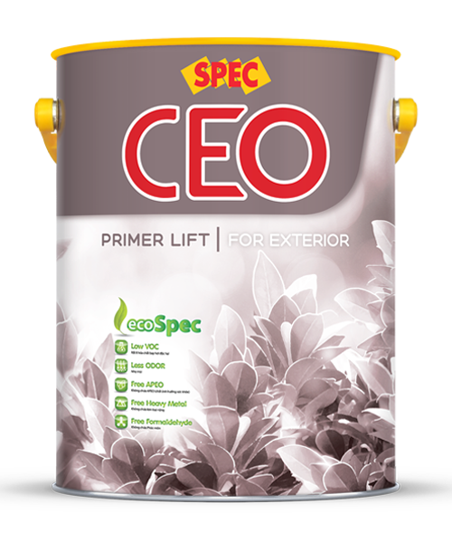 SPEC CEO PRIMER LIFT FOR EXTERIOR – SƠN LÓT NGOẠI THẤT SIÊU KHÁNG KIỀM VÀ KHÁNG MUỐI là sản phẩm sơn lót đặc biệt giúp làm tăng khả năng kháng kiềm và kháng muối, chống rêu mốc, tăng độ bám dính của sơn vào bề mặt tường, giúp cho lớp sơn phủ đều màu và tăng độ bền, thích hợp thi công các bề mặt tường ngoại thất gần khu vực biển. Ngoài ra, sản phẩm hướng đến tiêu chuẩn xanh với thành phần ít hóa chất bay hơi độc hại, nhẹ mùi, không chứa APEO (chất ảnh hưởng sức khỏe), không chứa kim loại nặng và không chứa Phóc-môn, thân thiện với môi trường và an toàn cho sức khỏe.