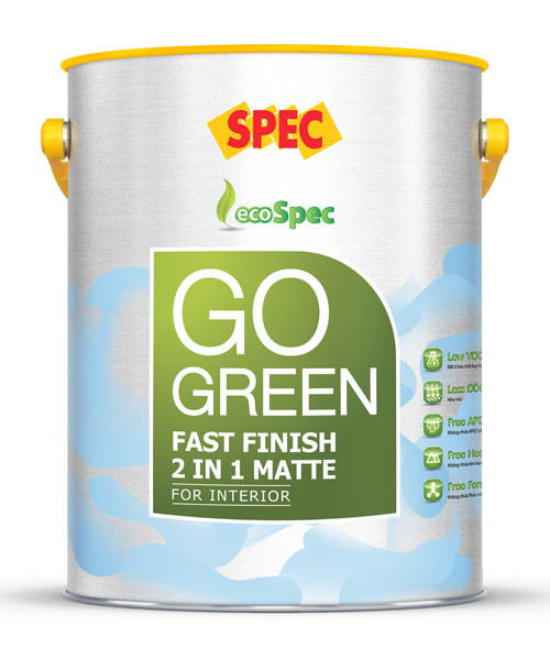 SPEC GO GREEN FAST FINISH 2 IN 1 MATTE FOR INTERIOR – SƠN NỘI THẤT 2 TRONG 1 CAO CẤP LÁNG MỊN sản phẩm sơn cao cấp thi công nhanh không cần sơn lót, với chất lượng cao hơn so với sơn thông thường về độ che phủ, độ bám dính, khả năng kháng kiềm và bền màu (*). Sản phẩm có độ che phủ cao thích hợp cho tường mới và cũ, có thể che lấp dễ dàng màu sơn cũ với khả năng chống nấm mốc, kháng kiềm tốt giúp bền màu, màu sắc đẹp, cùng bộ sưu tập màu phong phú, thích hợp dùng để trang trí các bề mặt tường nội thất.