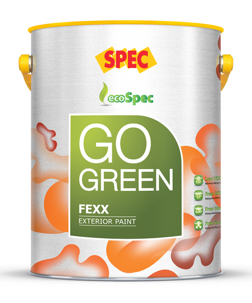 SPEC GO GREEN FEXX EXTERIOR PAINT – SƠN CHỐNG THẤM SPEC XANH NGOAI THẤT CAO CẤP với định hướng mang đến sản phẩm xanh cho các công trình hiện đại và cao cấp và công thức tiên tiến vừa kết hợp công nghệ chống thấm vừa kết hợp nhiều màu sắc cho tính năng trang trí mang đến sản phẩm hoàn toàn mới không cần pha loãng trước khi sử dụng, có tính năng chống thấm và kháng kiềm cao có thể lăn trực tiếp lên bề mặt tường mới mà không cần dùng bột trét và sơn lót trước. Đặc biệt màng có thể sơn co giãn được giúp che lấp các vết nứt vừa và nhỏ, thích hợp cho những vùng có khí hậu ẩm và mưa nhiều.