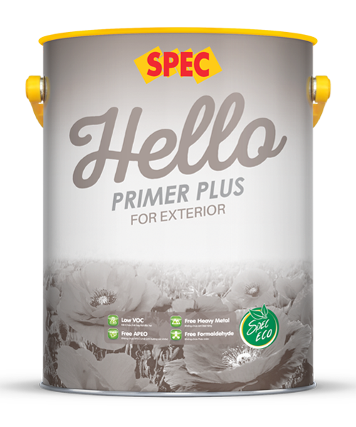 SPEC HELLO PRIMER PLUS FOR EXTERIOR – SƠN LÓT NGOẠI THẤT SIÊU KHÁNG KIỀM VÀ KHÁNG MUỐI là sản phẩm sơn lót có khả năng thẩm thấu cao, bám dính tốt lên bề mặt tường xi măng mới, trên bề mặt bột trét hoặc trên bề mặt lớp sơn cũ, đặc biệt với tính năng kháng kiềm cao và kháng muối vượt trội bảo vệ tối đa lớp sơn phủ hoàn thiện chống lại sự phát triển của rong rêu, nấm mốc và loang màu. Ngoài ra sơn còn hướng đến các tiêu chí xanh như ít hóa chất bay hơi độc hại, không chứa APEO (chất ảnh hưởng sức khỏe), không chứa kim loại nặng, không chứa Phóc-môn, thích hợp cho bề mặt tường ngoại thất của các công trình cao cấp gần các khu vực biển.